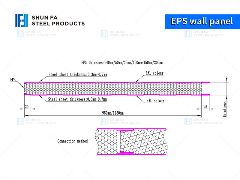 Our 20mm Metal Roof and Wall EPS Sandwich Panels, designed for modern warehouses, feature customizable RAL colors, thicknesses, 0.2-0.8mm steel sheets, and effective widths (950/1050/1000mm), offering tailored, durable solutions for industrial building needs.